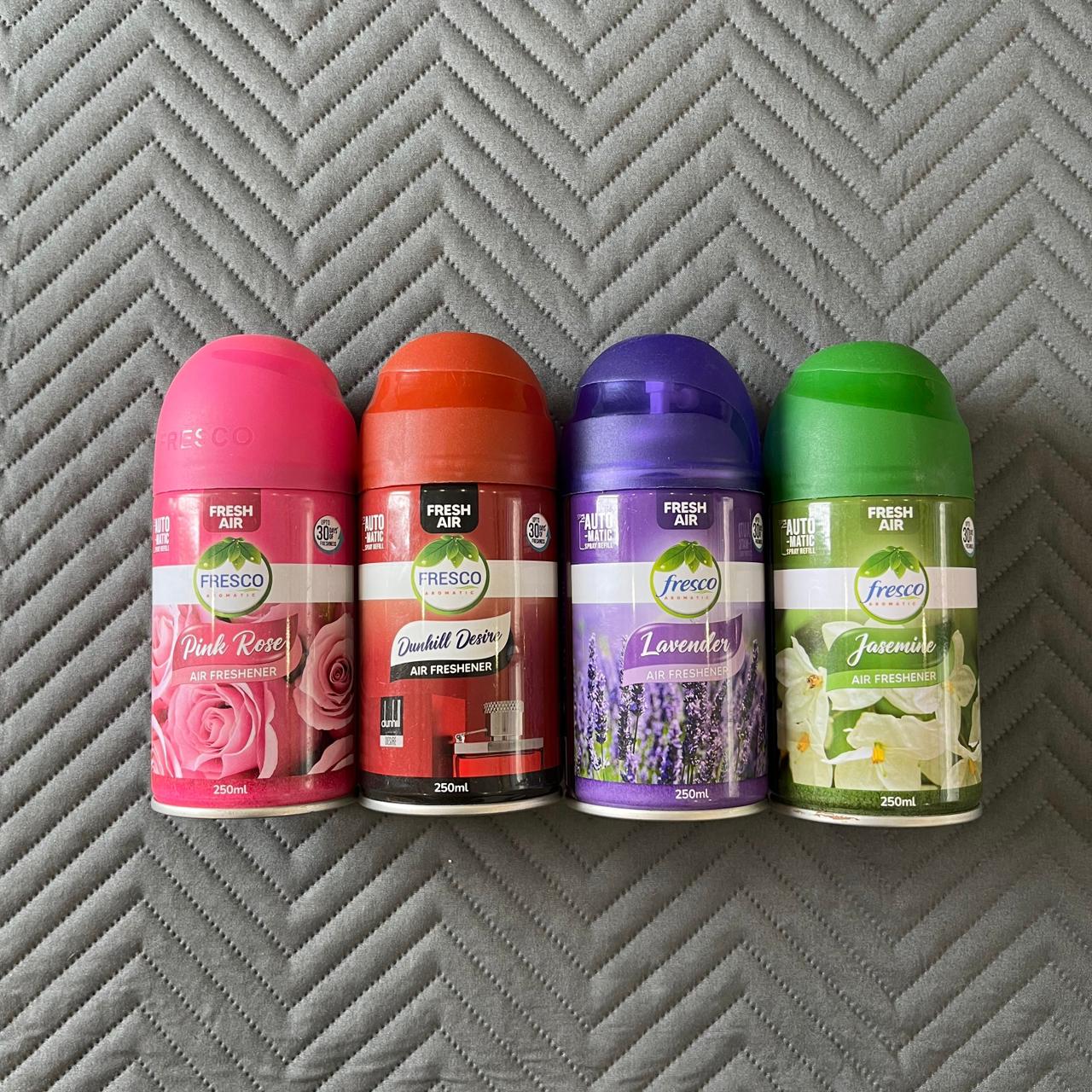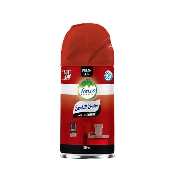 Buy Fresco 250ml Automatic Air Freshener Spray in premium fragrances: Pink Rose, Dunhill Desire, Lavender, and Jasmine and many more. These long-lasting room air fresheners are perfect for home, office, bathroom, and car use. Designed for use with auto spray dispensers, each aerosol can delivers powerful and continuous odor elimination and fresh scent. Ideal for automatic air freshener machines, these sprays provide an instant boost of freshness. Shop Fresco air fresheners for clean, refreshing, and fragrant air all day long.